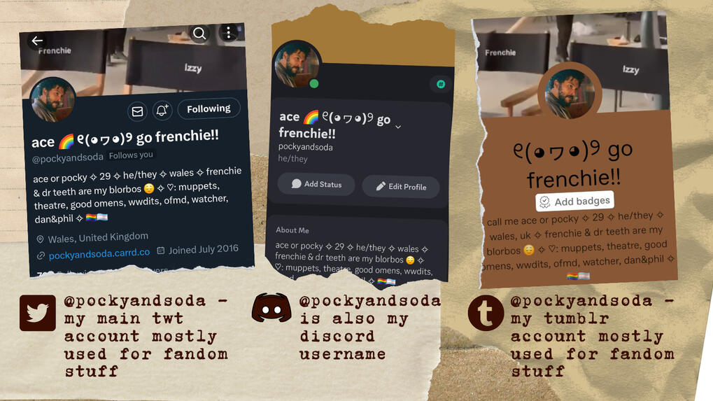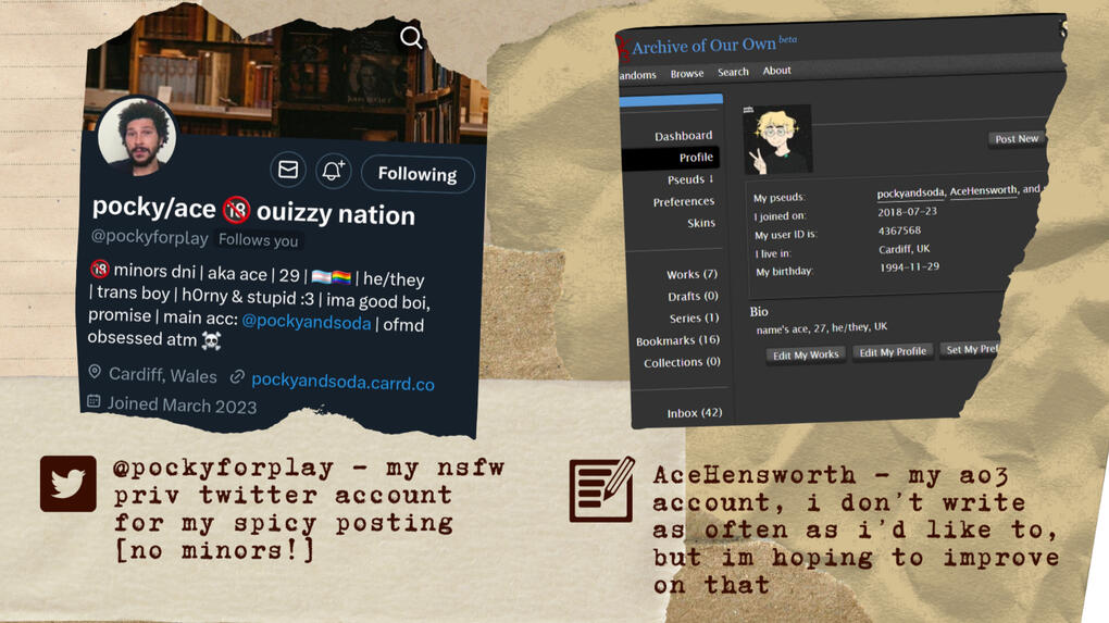 howdy-ho! my name's ace, but you can also call me pocky if you like. i've been a part of online fandom spaces since i was far too young to be, way back in the livejournal days, and somehow i keep on trucking! from superwholock to ourgoodshadows, nothing changes and yet everything does. i'm a bi trans neurodivergent disabled artist, writer, performer, academic, and teacher from cardiff. soon to return to study in paleoanthropology! online i mostly post about various old men yaoi, memes, and my fav aesthetics. check out the above interests tab for more details!